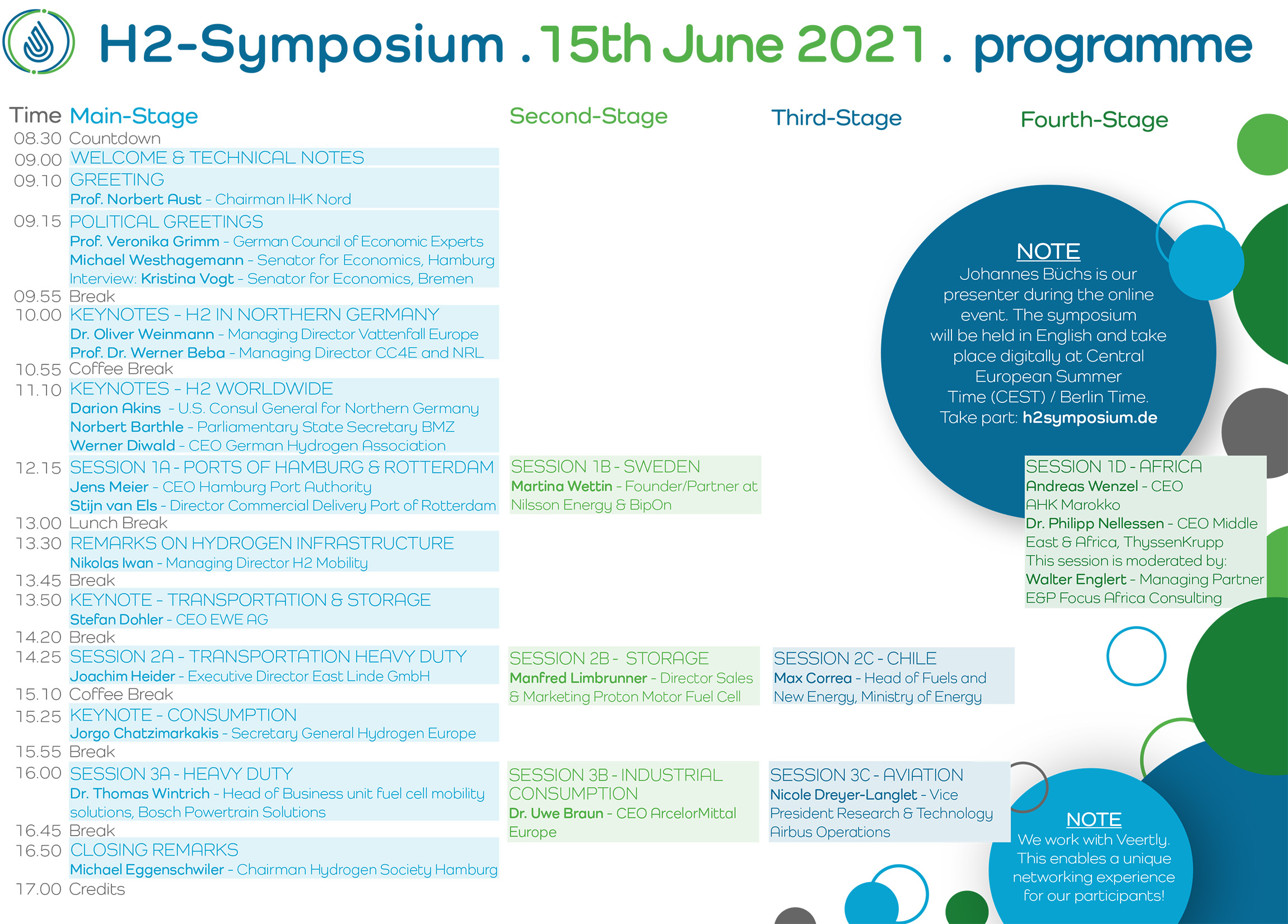 Hydrogen is definitely a game changer for our future demands concerning energy and mobility – this can be summarized from the 2. International Hydrogen Symposium, jointly organized by Hydrogen Society Hamburg and IHK Nord, which took place on June 15th 2021. During this virtual conference, best-practice examples, business opportunities for hydrogen and political perspectives were presented and discussed – with more than 800 registered attendees from all over the world! Most content is now available here on our website – so feel free to re-watch certain presentations and discussions, or to deepen your H2-knowledge by going into greater detail, all along the hydrogen value chain.